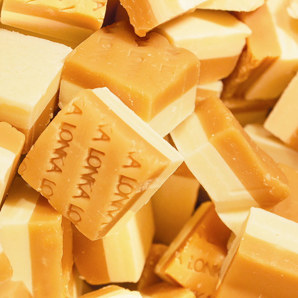 Sokeri, glukoosi, MAITOtiiviste, maitorasva (palmu, shea), kosteudensäilyttäjä, (sorbitoli), suola, emulgointiaine (auringonkukkalesitiini) värit (E150c, E160a, E171), aromit. Saattaa sisältää jäämiä MANTELEISTA.