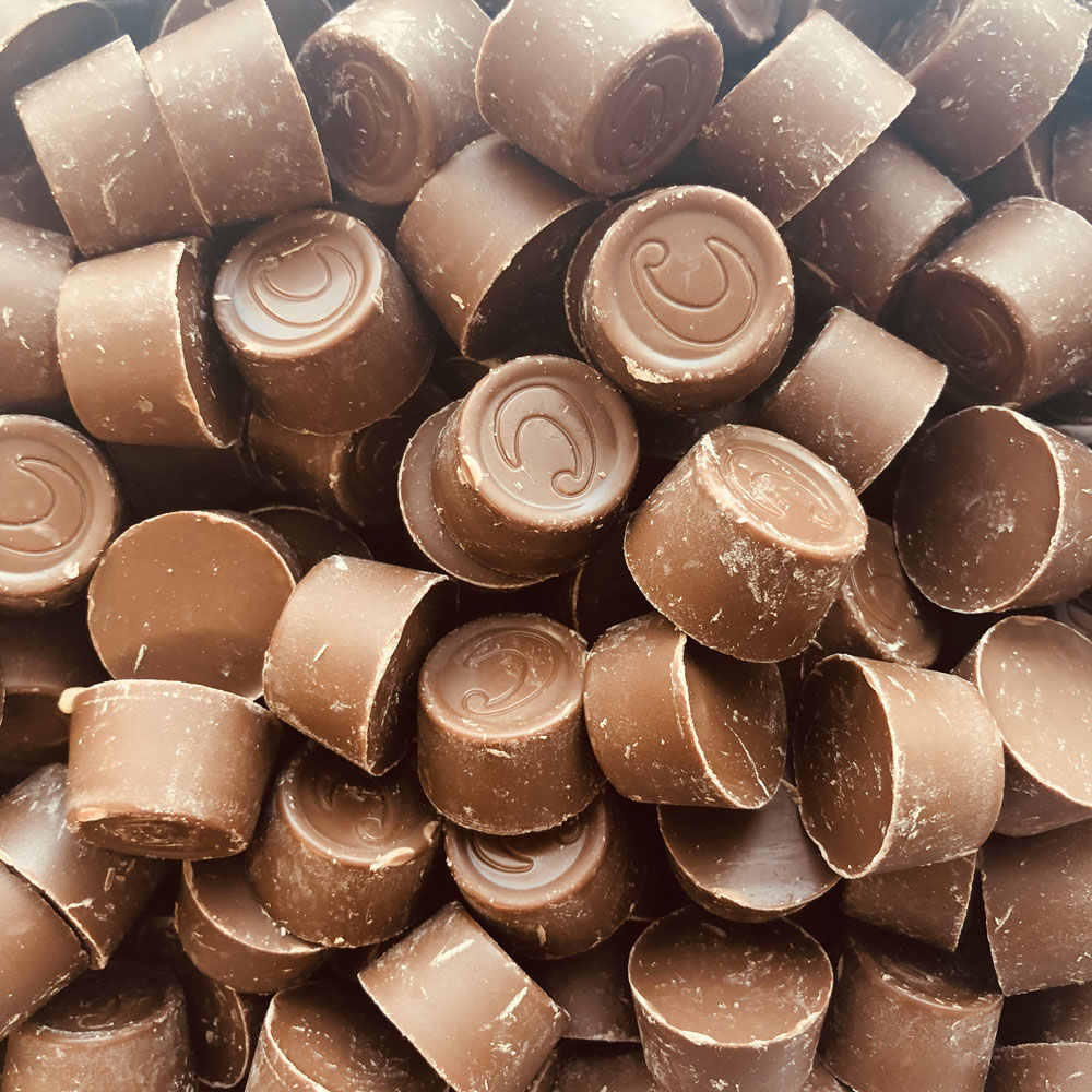 Maitosuklaanappi täynnä pehmeää juoksevaa toffeeta.