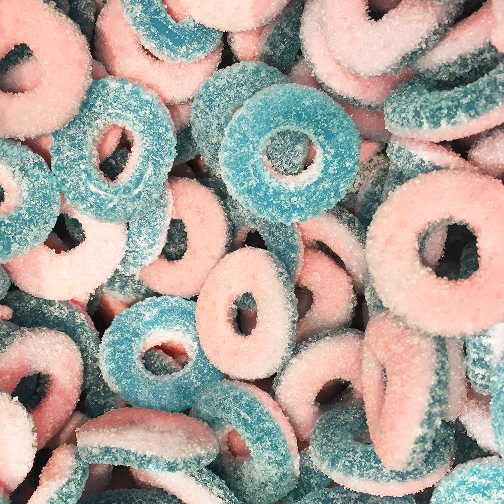 Ainesosat: Sokeri, glukoosi-fruktoosisiirappi, vesi, gelatiini, kosteudensäätöaine (sorbitoli), happamuuden säätöaineet (sitruunahappo, omenahappo), bikarbonaatti, aromiaine, väriaineet (E120, E133).