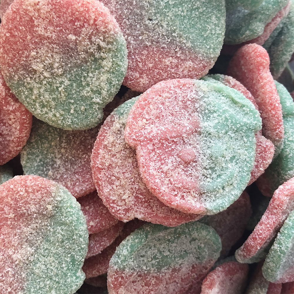 Sokeri, glukoosi-fruktoosisiirappi, gelatiini, happamuudensäätöaineet: omenahappo (E296), sitruunahappo (E330), natriumkarbonaatti, aromi, väriaine: E120, E133, E171.