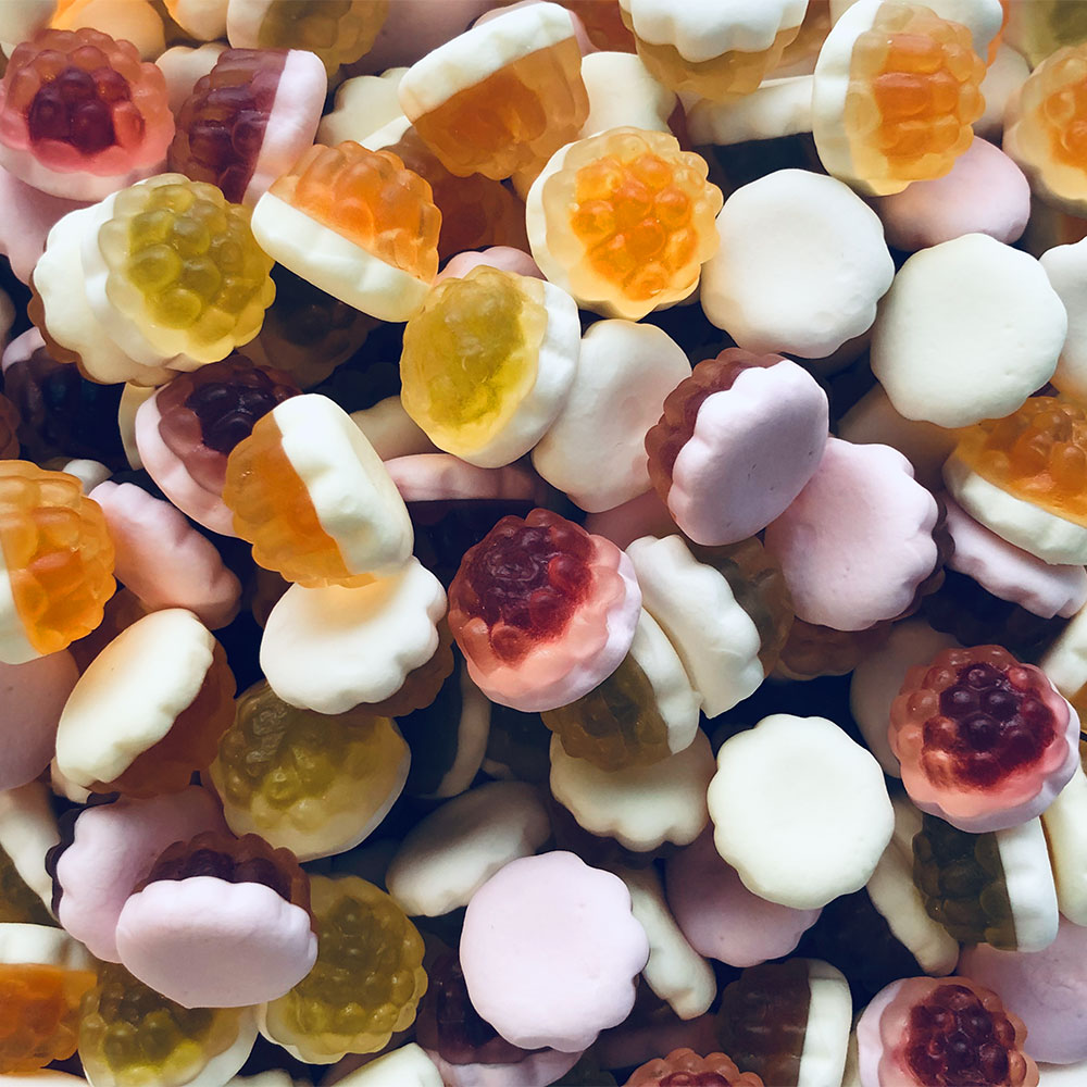 Ingredienser: Glukossirap; socker; druvsocker; gelatin; syror: citronsyra, MJÖLKsyra; frukt- och plantkoncentrat: hallon, mango, apelsin, morot, safflor, spirulina, citron, hibiskus; stabiliseringsmedel: karragenan; arom; antioxidationsmedel: tokoferolrika extrakt; ytbehandlingsmedel: bivax vitt och gult, karnaubavax; invertsockersirap.