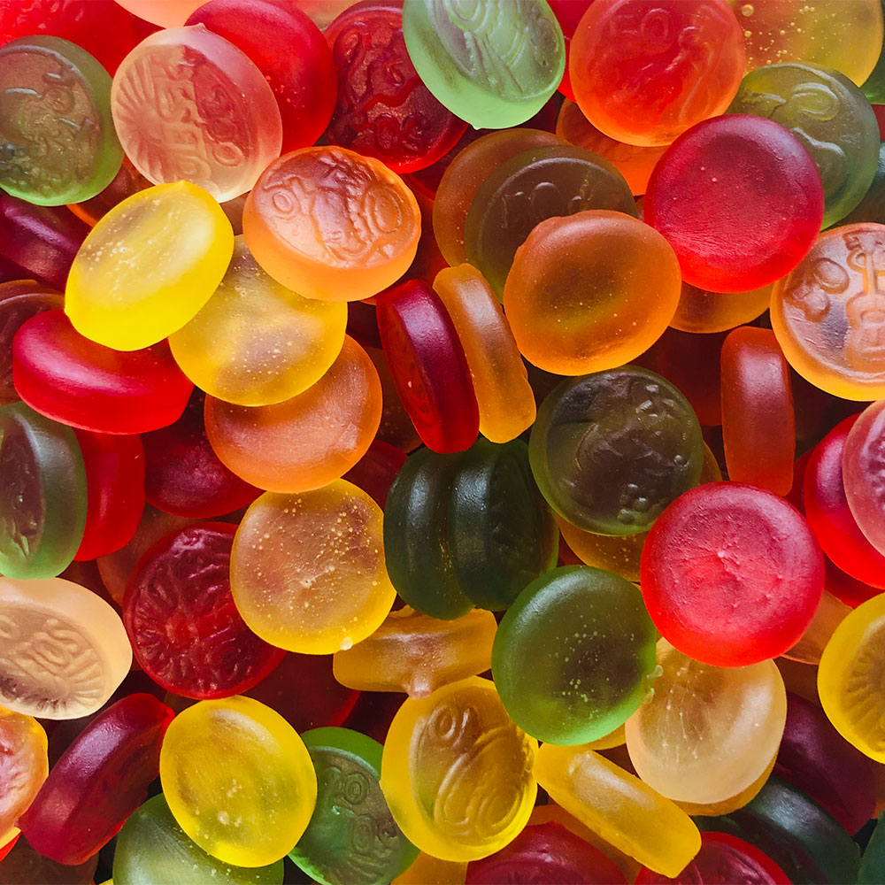 Glukossirap, socker, gelatin, druvsocker, syra: citronsyra, frukt- och grönsakskoncentrat: spirulina alger, safflor, äpple, citron, rädisa, sötpotatis, morot, svarta vinbär, hibiskus, invertsocker, arom, färger: curcumin, karmin, karmin, karmin, karmin, karmin: kokosnöt, palmkärna, ytbehandlingsmedel: bivax vit och gul, karnaubavax. Kan innehålla VETE.