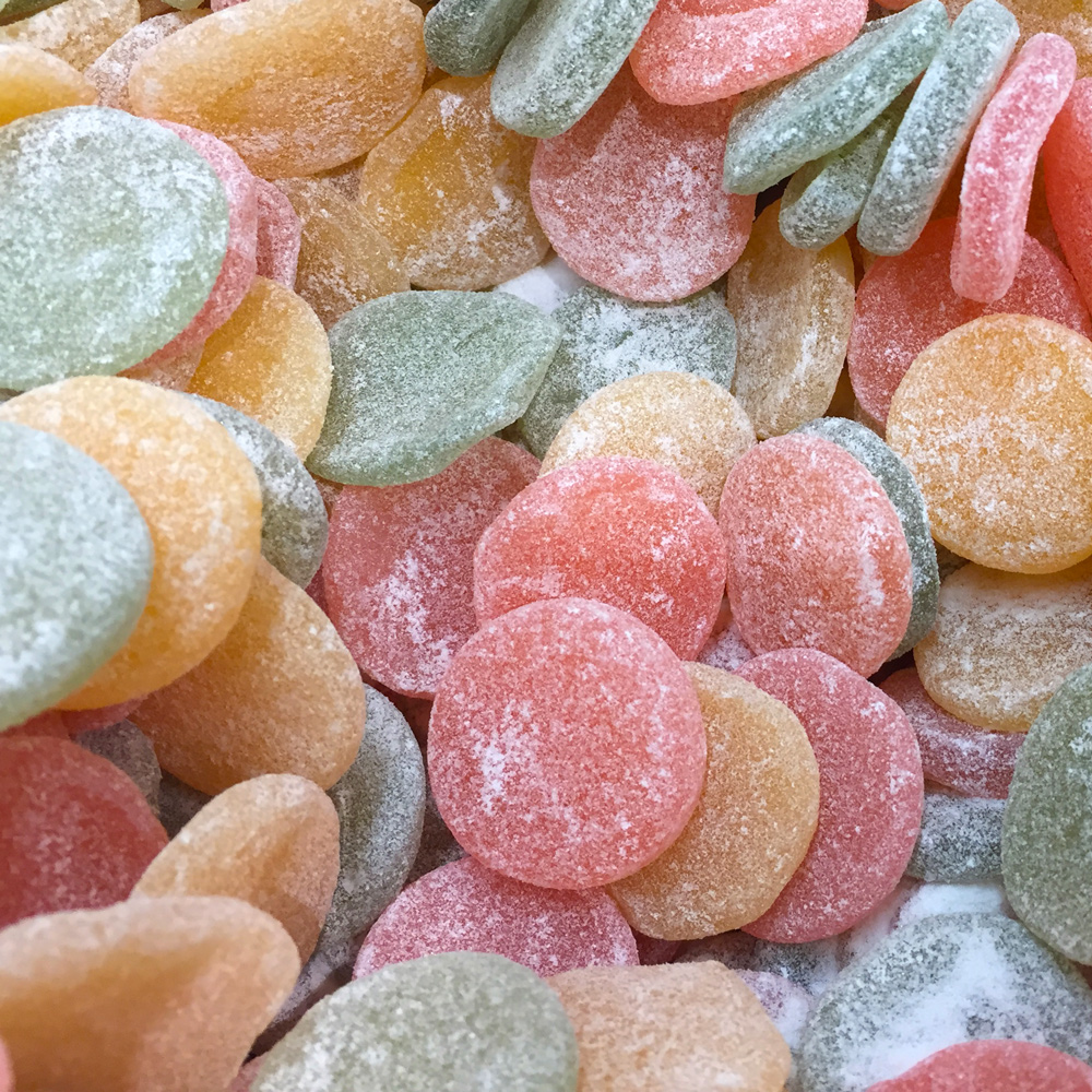 Ainesosat: sokeria, glukoosisiirappia, muunnettua maissitärkkelystä, liivatetta, tärkkelystä, kosteudensäilyttäjää (sorbitolia), happoa (maitohappoa), aromeja, happamuudensäätöainetta (natriumlaktaattia), värejä (E120, E141, E160a).