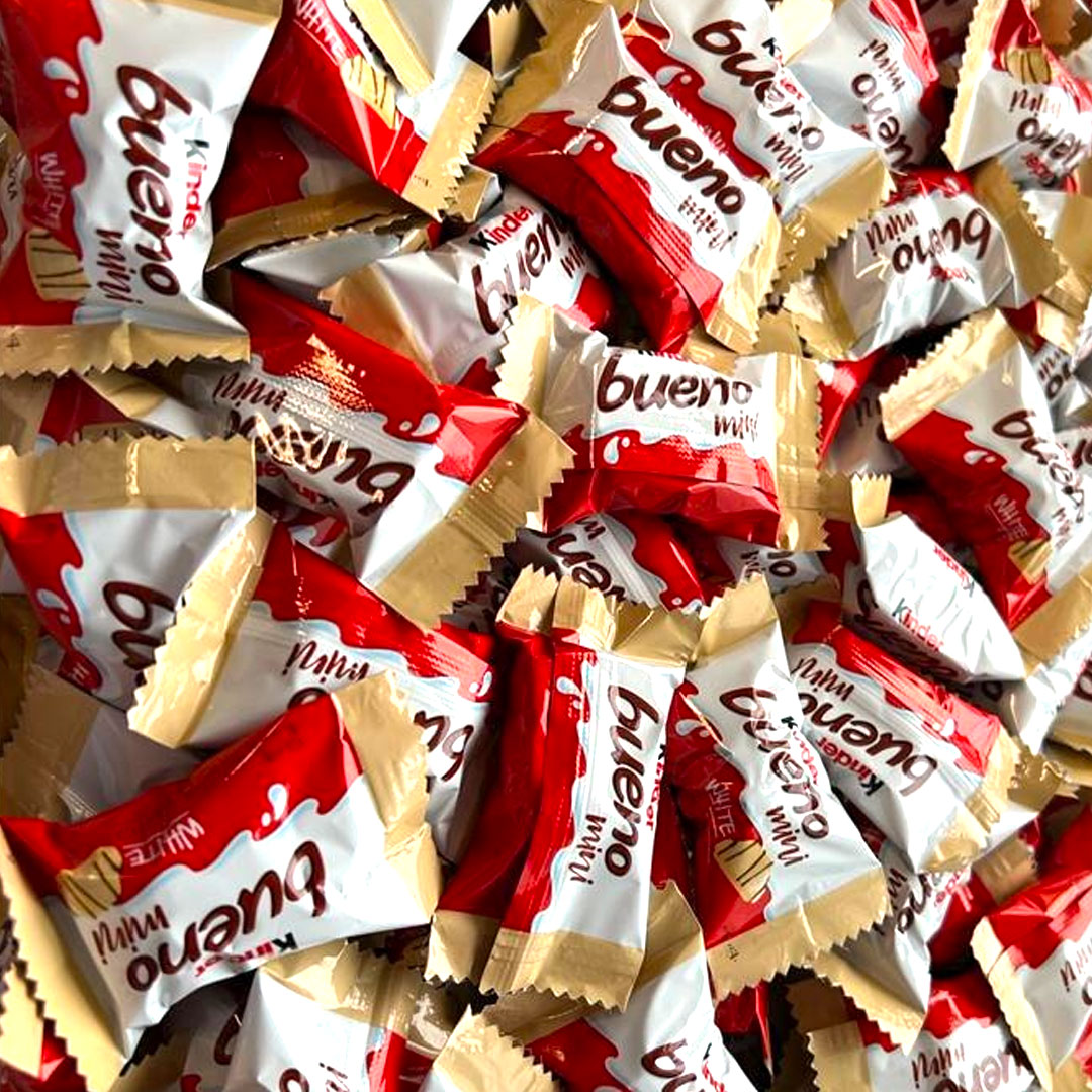 Kinder Bueno mini White, valkosuklainen Kinder suklaakonvehti. Valkosuklaalla kuorrutettu ohut rapea vohveli, jonka sisällä silkkisen pehmeää hasselpähkinätäytettä.