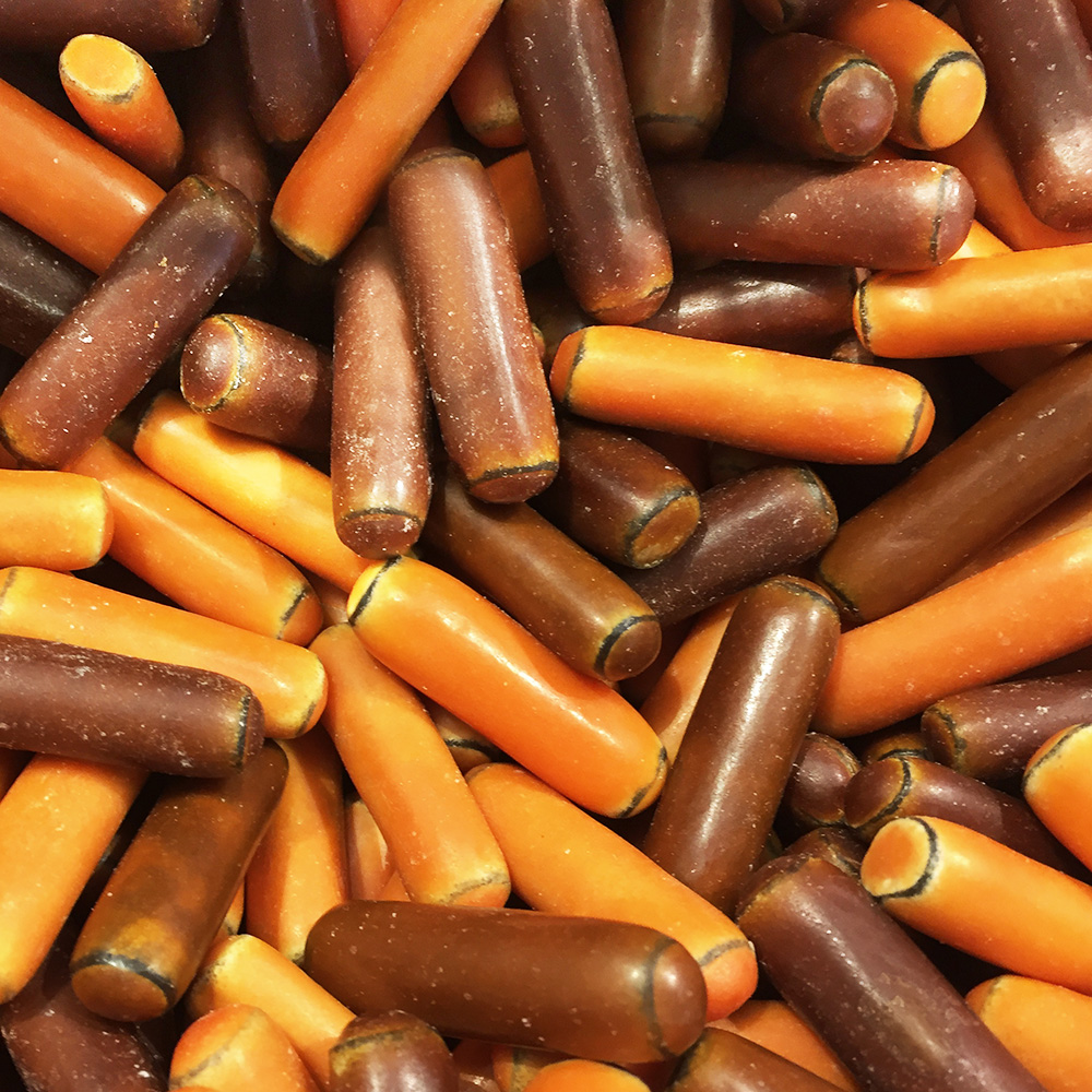 Socker, brun sockersirap, VETEMJÖL, glukossirap, rålakrits, majsstärkelse, rostad socker, ammoniumklorid, arom, färgämnen: kurkumin, karmin, gelatin, syra: citronsyra, klumpförebyggande medel: talk, palmolja, ytbehandlingsmedel: bivax vitt och gult.