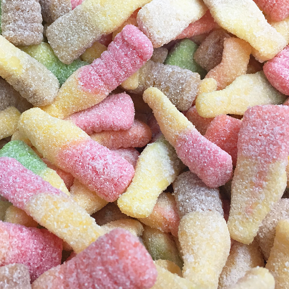 Ainesosat: glukoosifruktoosisiirappi, sokeri, liivate, hapot (sitruuna, omena), värit(kalsiumkarbonaatti, luteiini, sokerikulööri, karmiini, briljantti sininen FGF), happamuudensäätöaine (natriumamalate), armit.