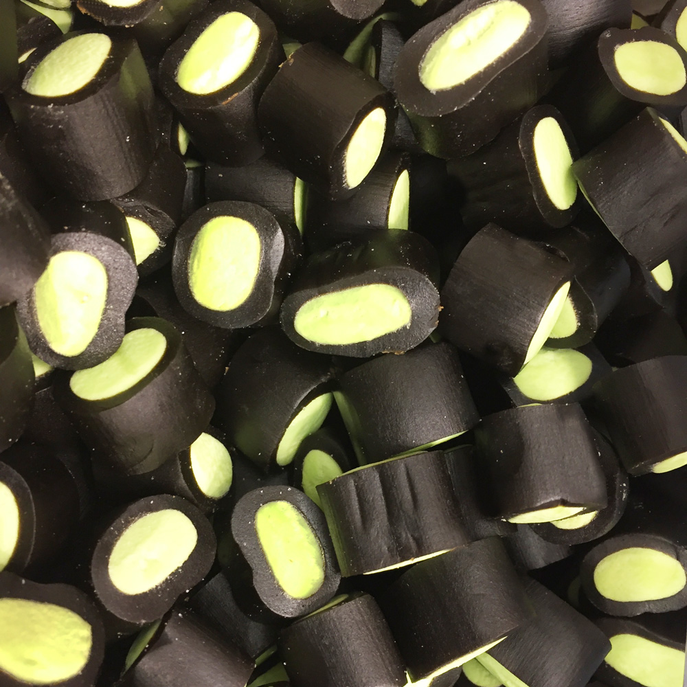Socker, melass, glukossirap,vetemjöl, kokosfett, gelatin, stabiliseringsmedel (glycerol), lakritsextrakt, salt, surhetsreglerande medel (E330), aromer, färgämnen (E153, E141), emulgeringsmedel (E471), beläggningsmedel (E901).
