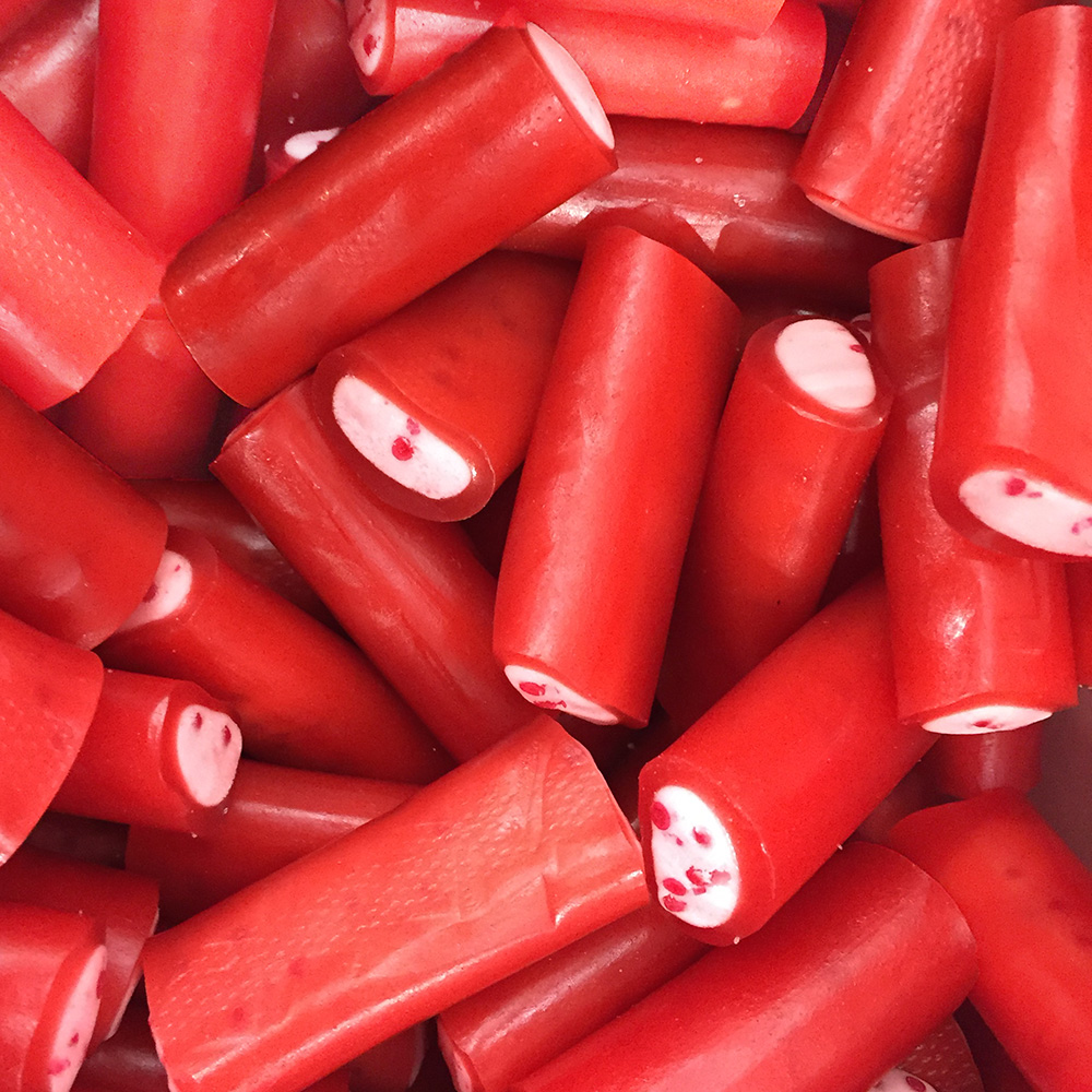Ainesosat: Sokeri, maissisiirappi, inverttisokerisiirappi, muunnettu maissitärkkelys, vehnätärkkelys, vehnäjauho, kookosrasva, glyselori, sitruunahappo, maitohappo, perunatärkkelys, liivate, luonnollinen ja keinotekoinen aromit, happamuudensäätöaineet )kaliumsitraatti), emulgointiaine (mono- ja diglyseridit, rasvahappo), pintakäsittelyaineet, (mehiläisvaha, karnaubavaha), arabikumi, tiivisteet, (porkkana)mustaherukka, sitruuna, saflori, selja, kookos), rapsiöljy, oliiviöljy, väri (kokenillikirva)