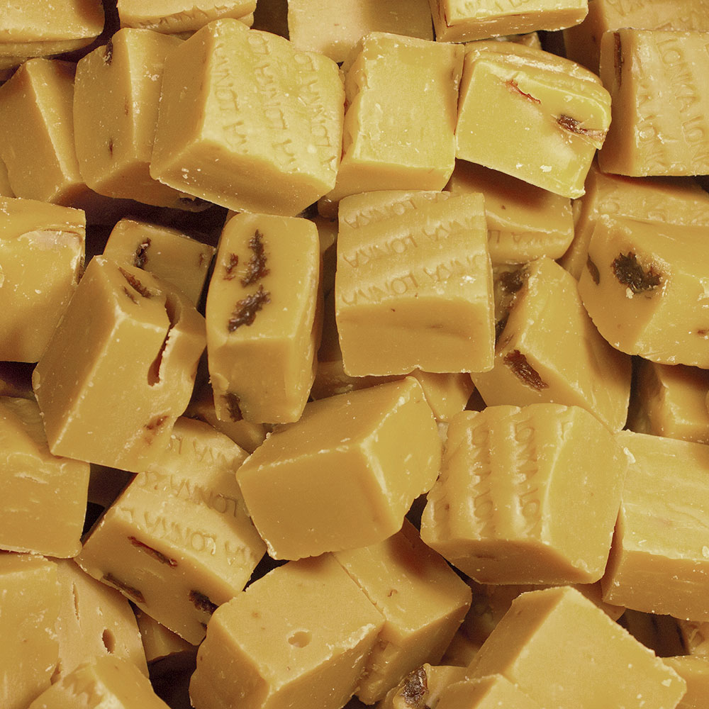 Sokeri, glukoosisiirappi, kovetettu kasvirasva (kookos ja palmuydin), rusina, rasvaton MAITOjauhe, suola, emulgointiaine, (SOIJAlesitiini), aromit.