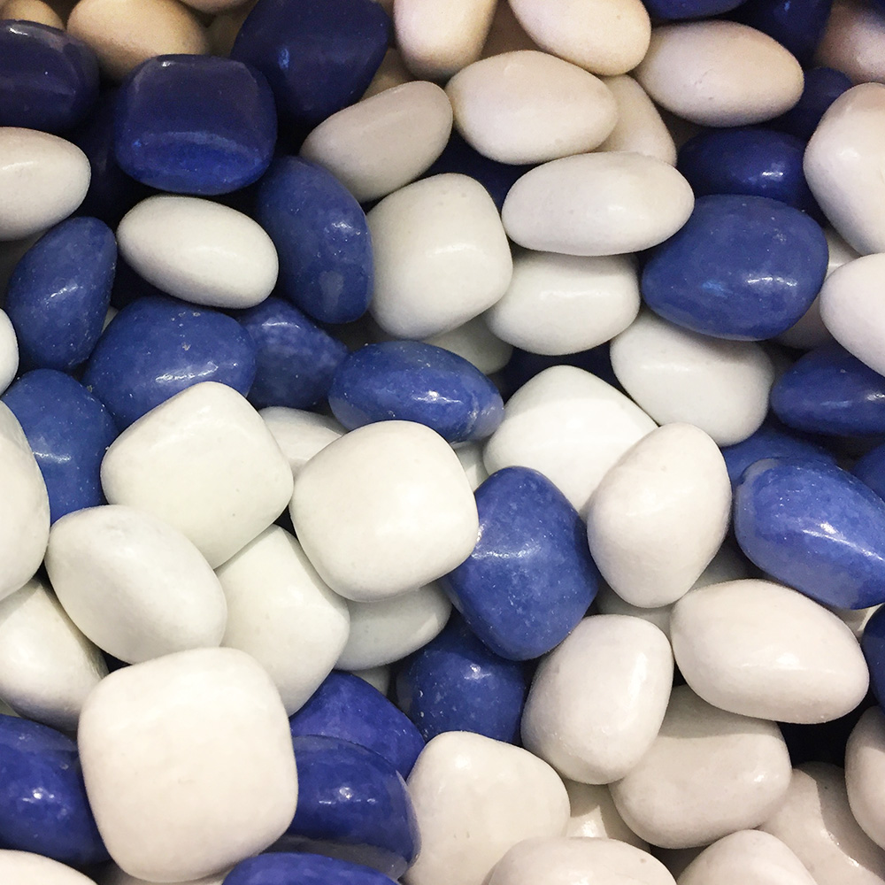 Sini-valkoinen kahden upean värin raesekoitus. Rapean kuoren alla sopivan tahmeaa salmiakkitäytettä.