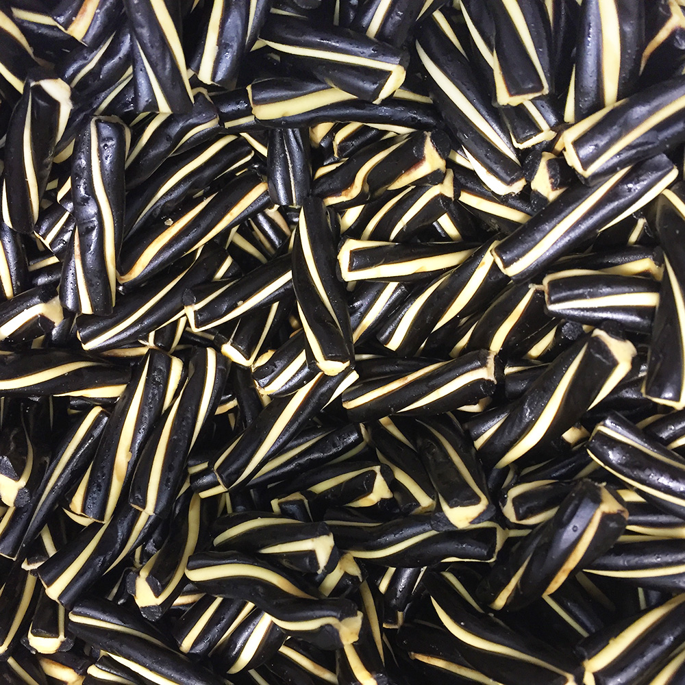 Socker, melass, glukossirap, vetemjöl, kokosfett, gelatin, stabiliseringsmedel (glycerol), lakritsextrakt, salt, surhetsreglerande medel (E330), aromer, färg (E153), emulgeringsmedel (E471), ytbehandlingsmedel (E901).