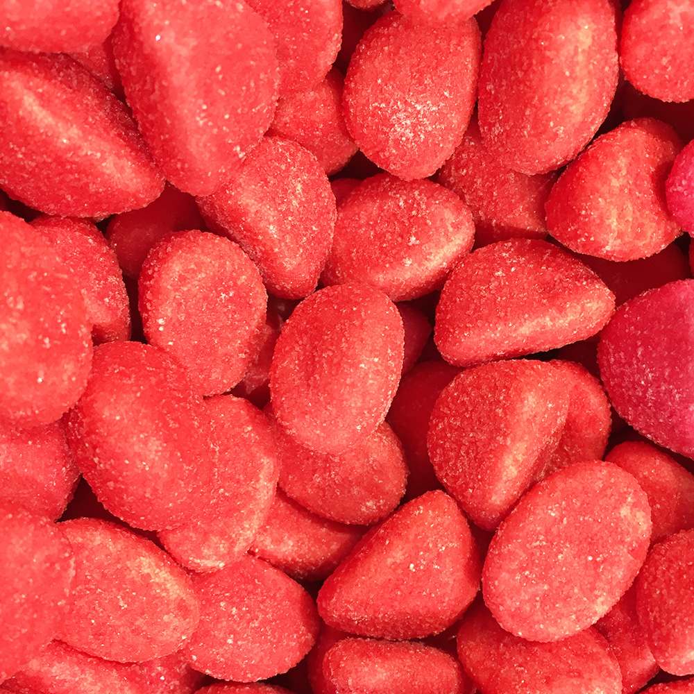 Ainesosat: Sokeri, glukoosisiirappi, liivate, happo, sitruunahappo, aromi, väri: karmiinit, paahdettu sokeri.