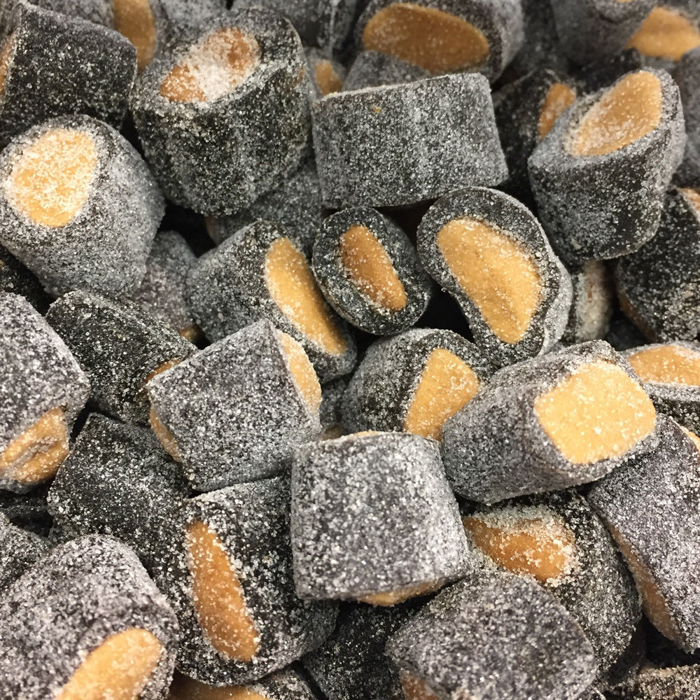 sokeri, vehnäjauho, tärkkelyssiirappi, melassi, ammoniumkloridi, kasvirasva (soijaöljy, palmuöljy, rapsiöljy, shea siemenöljy), gelatiini, lakritsiuute, suola, stabilointiaine (E422), aromeja, värit (E150c, E153).