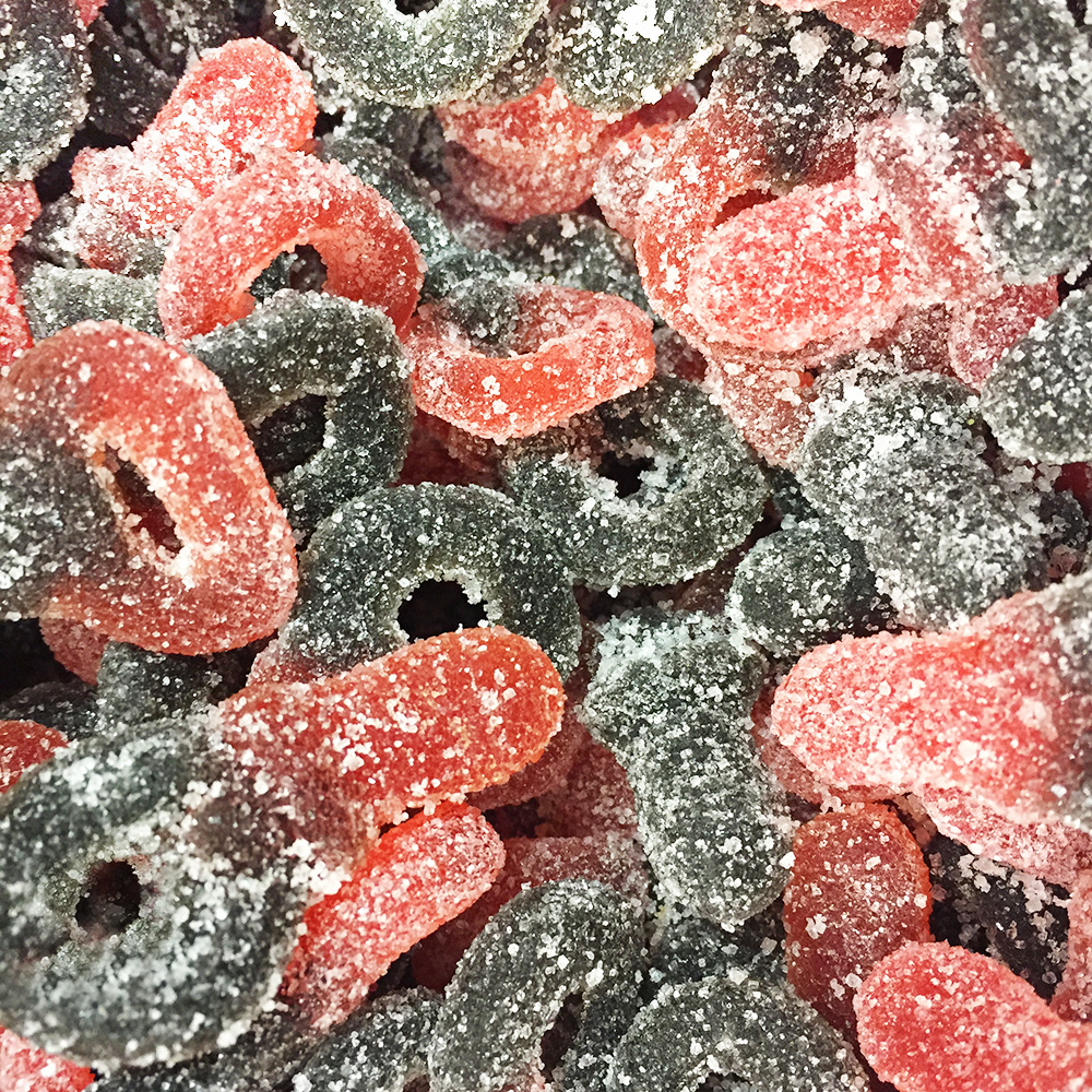Ainesosat: Sokeri, glukoosisiirappi, liivate, omenahappo (E296), salmiakki, lakritsi, värit (E120, E153).