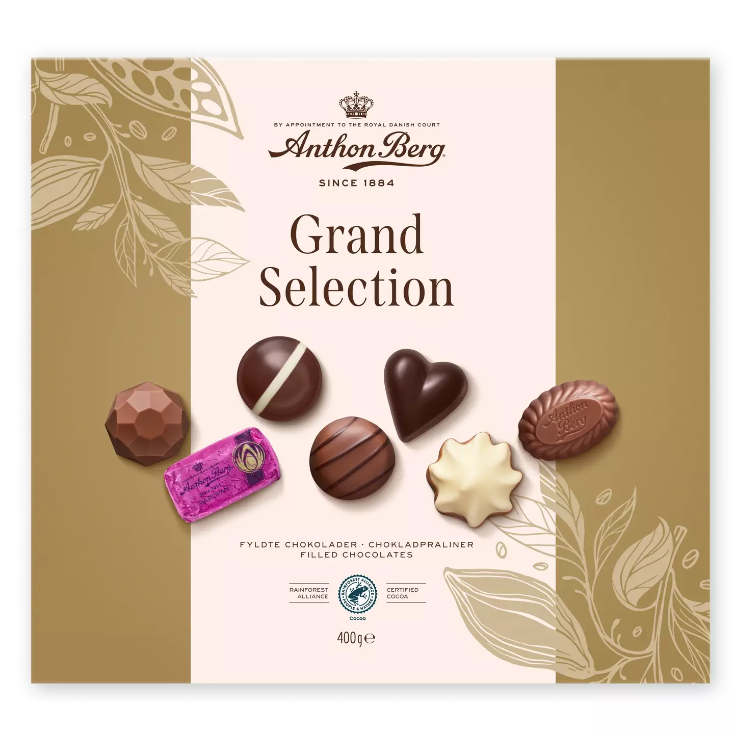 Anthon Berg Grand Selection on runsas ja ylellinen 400 gramman suklaarasia, joka kokoaa yhteen Anthon Bergin klassisimmat ja pidetyimmät täytetyt suklaat. Valikoima sisältää useita erilaisia pralineja, joissa yhdistyvät nougat, marsipaani, karamelli, pähkinät, kookos sekä hienostuneet liköörisävyt.