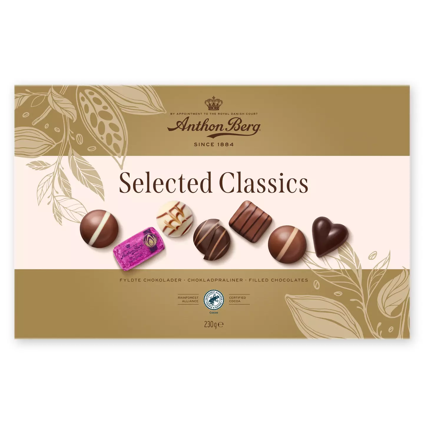 Anthon Berg Selected Classics on huolella koottu valikoima klassisia täytettyjä suklaita arvostetulta tanskalaiselta suklaatalolta. Rasiasta löytyy useita suosikkimakuja, kuten karamellitryffeli, vaniljatryffeli, mantelinen maitosuklaa, valkosuklaa sekä liköörillä maustettuja pralineja. Suklaat valmistetaan korkealaatuisesta kaakaosta, ja valikoima tarjoaa monipuolisen makuelämyksen niin lahjaksi kuin omaan herkutteluhetkeen.