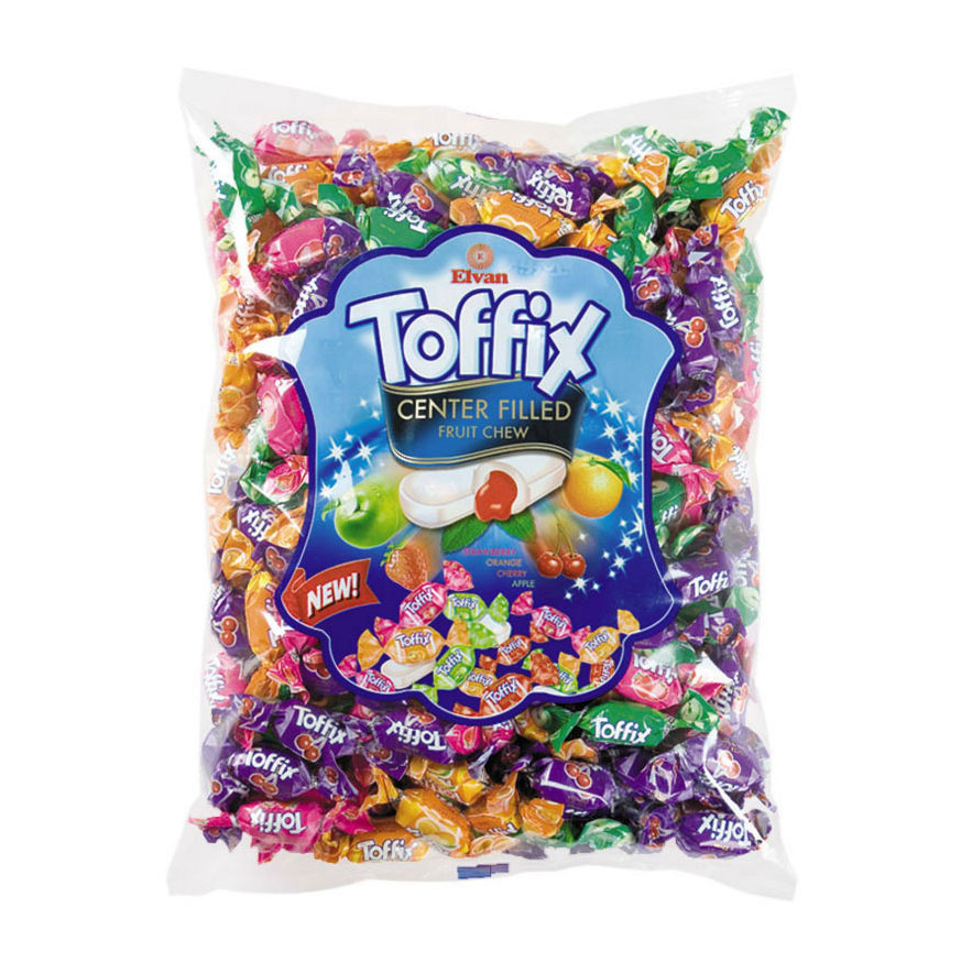Hedelmätoffeeta kilon säkissä. Valkoisen kermatoffeen sisällä kirpeän raikas hedelmähyytelö, makuina: kirsikka, omena, mansikka ja appelsiini.