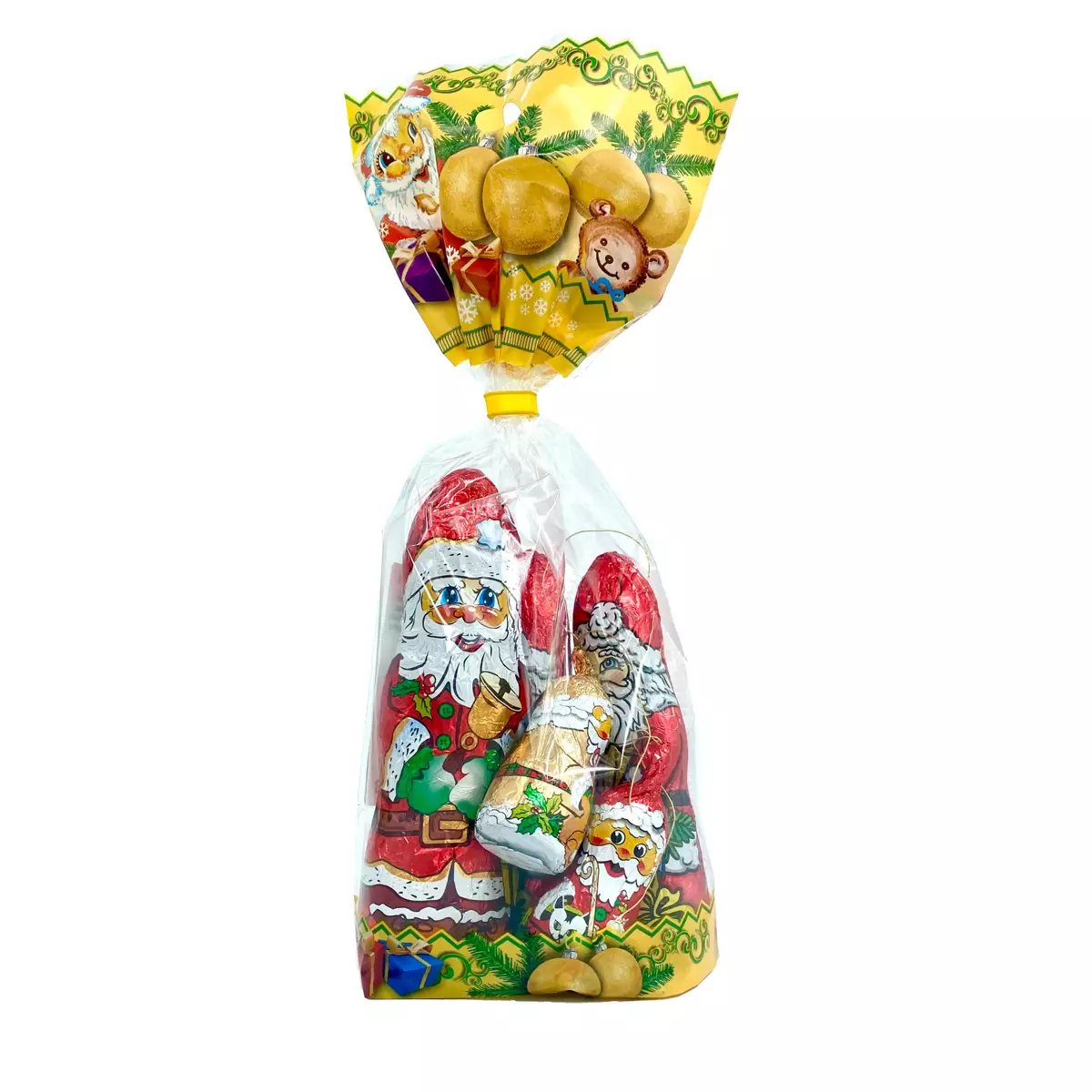 Perinteiset suklaiset kuusenkoristeet. Pussissa on kauniita, kimaltaviin kääreisiin kiedottuja joulupukkuja, kuusenkäpyjä sekä joulupalloja.