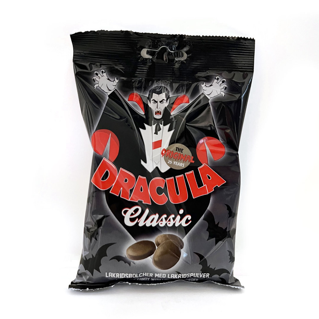 Dracula Classic on varmasti se klassisin kova Dracula -salmiakkiperheen pilleri, jonka pinnalla on aitoa Dracula -pulveria. Sopii vallan mainiosti tarjoitavaksi pyhänpäin eli kansainvälisesti Halloweenin juhlapöytään tai karkkikulhoon.