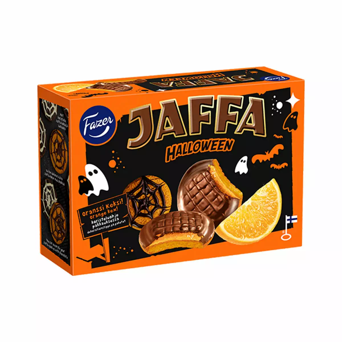 sokeri, glukoosisiirappi, VEHNÄjauho, KANANMUNA, kaakaomassa, dekstroosi, stabilointiaine (E422), kaakaovoi, kasviöljy (rypsi), MAITOrasva, happamuudensäätöaineet (E330, E331), värjäävä elintarvike (punajuuritiiviste), hyytelöimisaine (E440), aromit (mm. appelsiini), nostatusaineet (E450, E500, E503), emulgointiaineet (SOIJAlesitiini, E471, E475, E477, E481), appelsiinitäysmehutiiviste (0,2%), riisijauho, väri (E160a). SAATTAA SISÄLTÄÄ MUUTA GLUTEENIA SISÄLTÄVÄÄ VILJAA. Tummassa suklaassa vähintään 47% kaakaota.