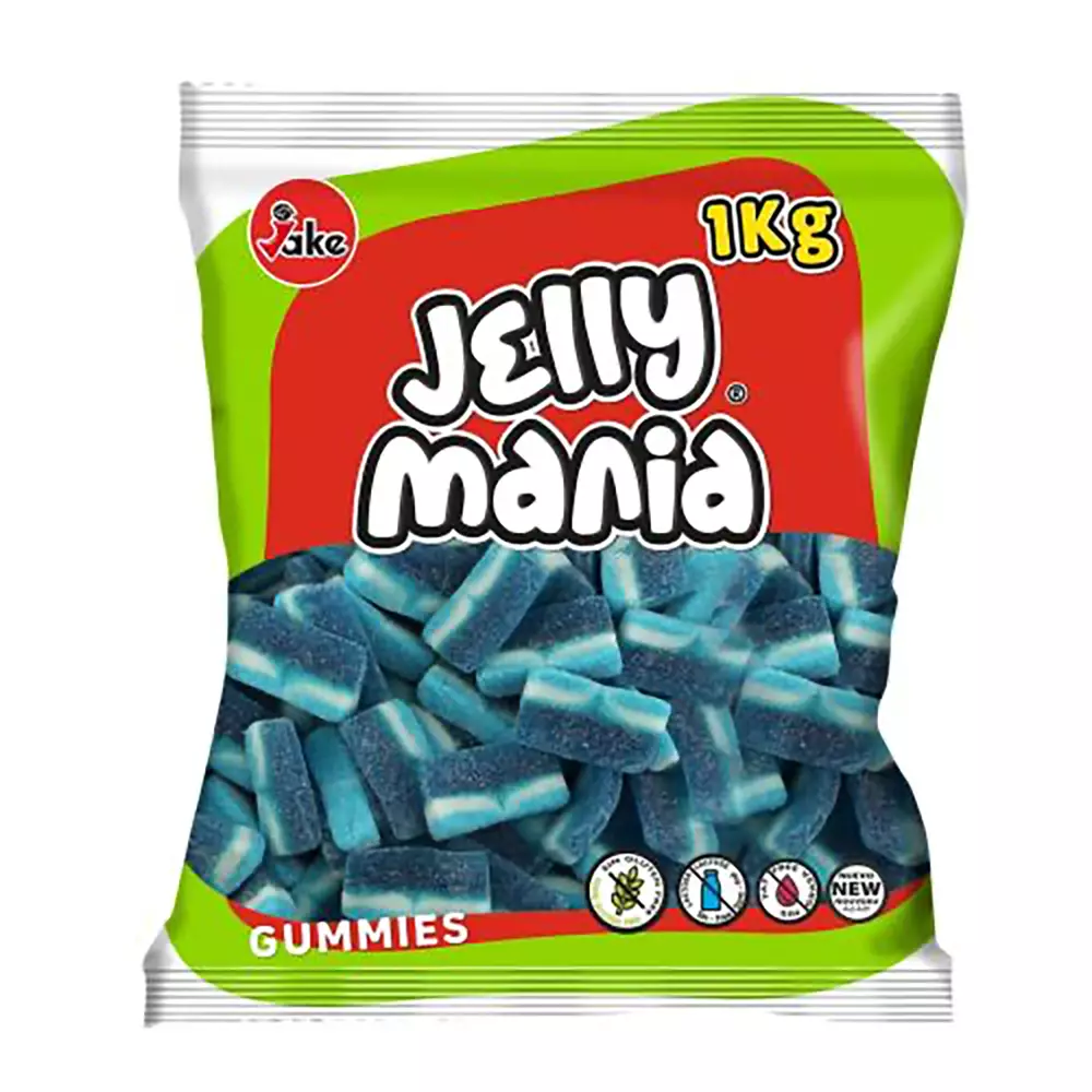 Glukossirap, socker, vatten, stärkelse, gelatin, syra (citronsyra, äppelsyra), aromer, surhetsreglerande medel (natriumcitrat), färgämne: E133.