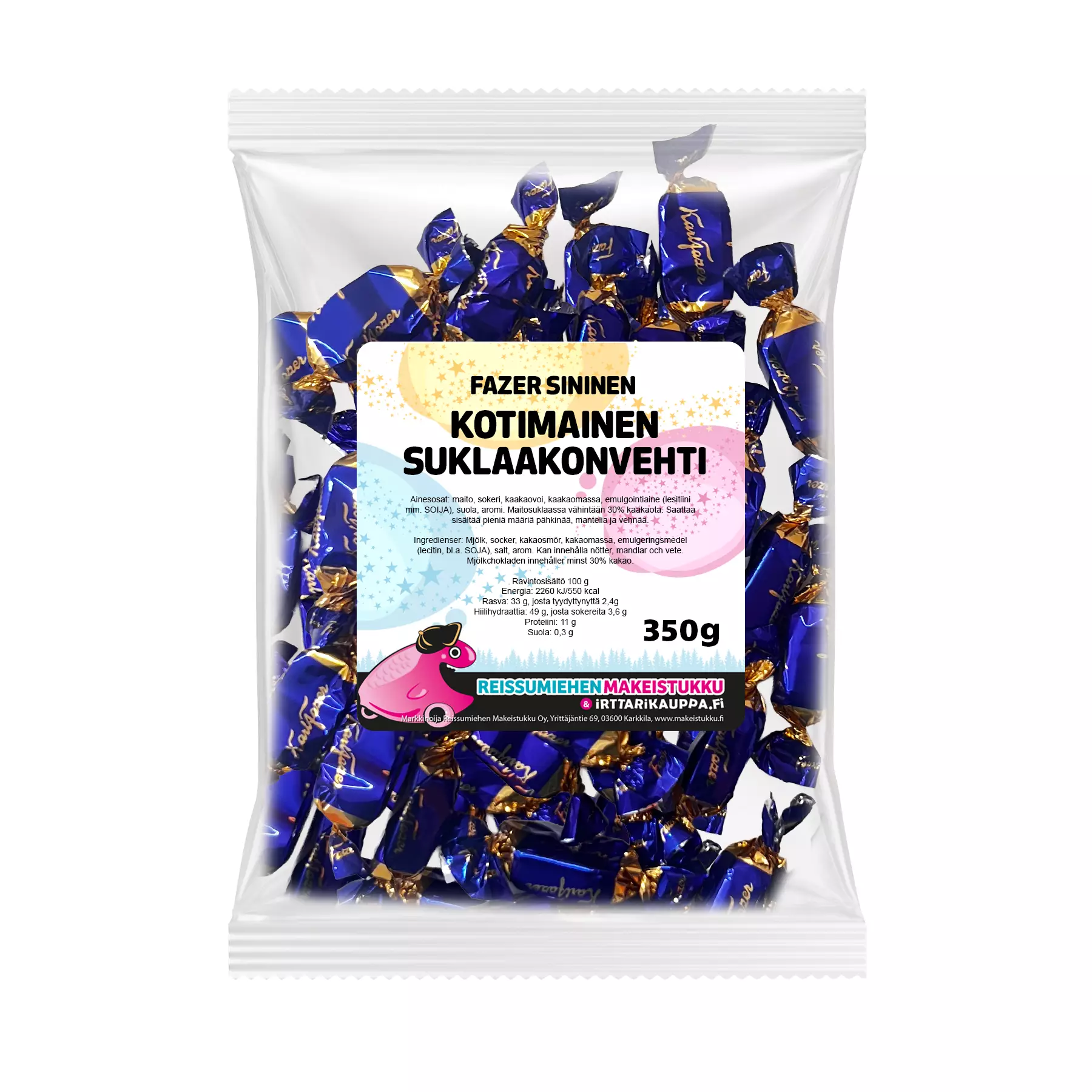 Ainesosat: maito, sokeri, kaakaovoi, kaakaomassa, emulgointiaine (lesitiini mm. SOIJA), suola, aromi. Maitosuklaassa vähintään 30% kaakaota. Saattaa sisältää pieniä määriä pähkinää, mantelia ja vehnää. Muista tarkistaa ainesosat myös pakkauksesta.
