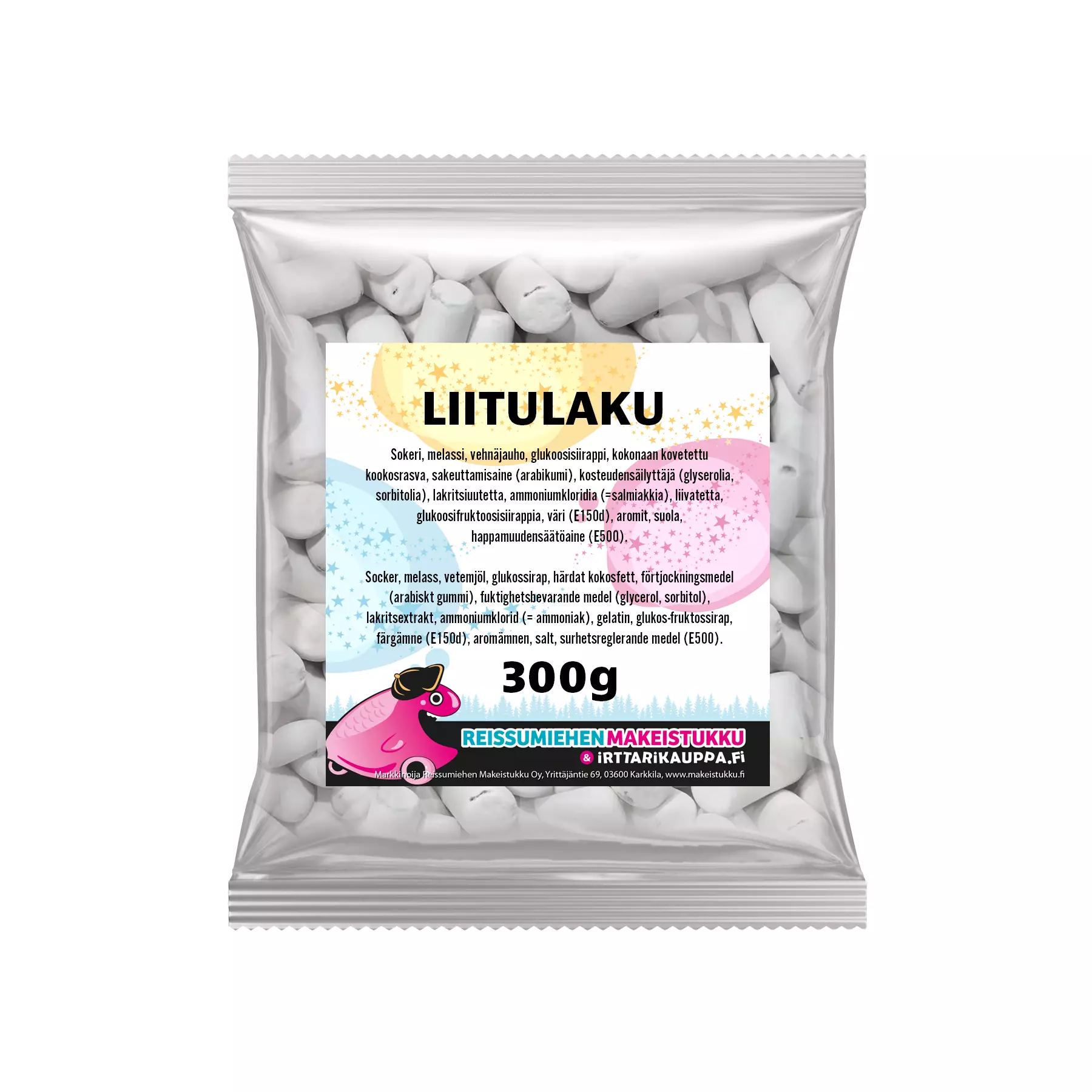 Sokeri, melassi, vehnäjauho, glukoosisiirappi, kokonaan kovetettu kookosrasva, sakeuttamisaine (arabikumi), kosteudensäilyttäjä (glyserolia, sorbitolia), lakritsiuutetta, ammoniumkloridia (=salmiakkia), liivatetta, glukoosifruktoosisiirappia, väri (E150d), aromit, suola, happamuudensäätöaine (E500).