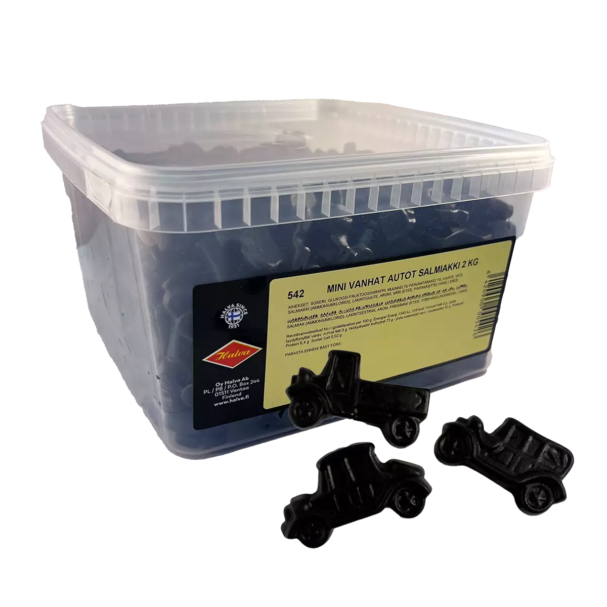 Halvan vanhat autot ovat ikimuistoisia salmiakkikarkkeja. Nyt voit ostaa tukkukoossa kokonaisen 2 kg laatikon näitä klassikkosalmiakkeja. Mini salmiakkiautot ovat hieman pienempiä versioita... Lue lisää
