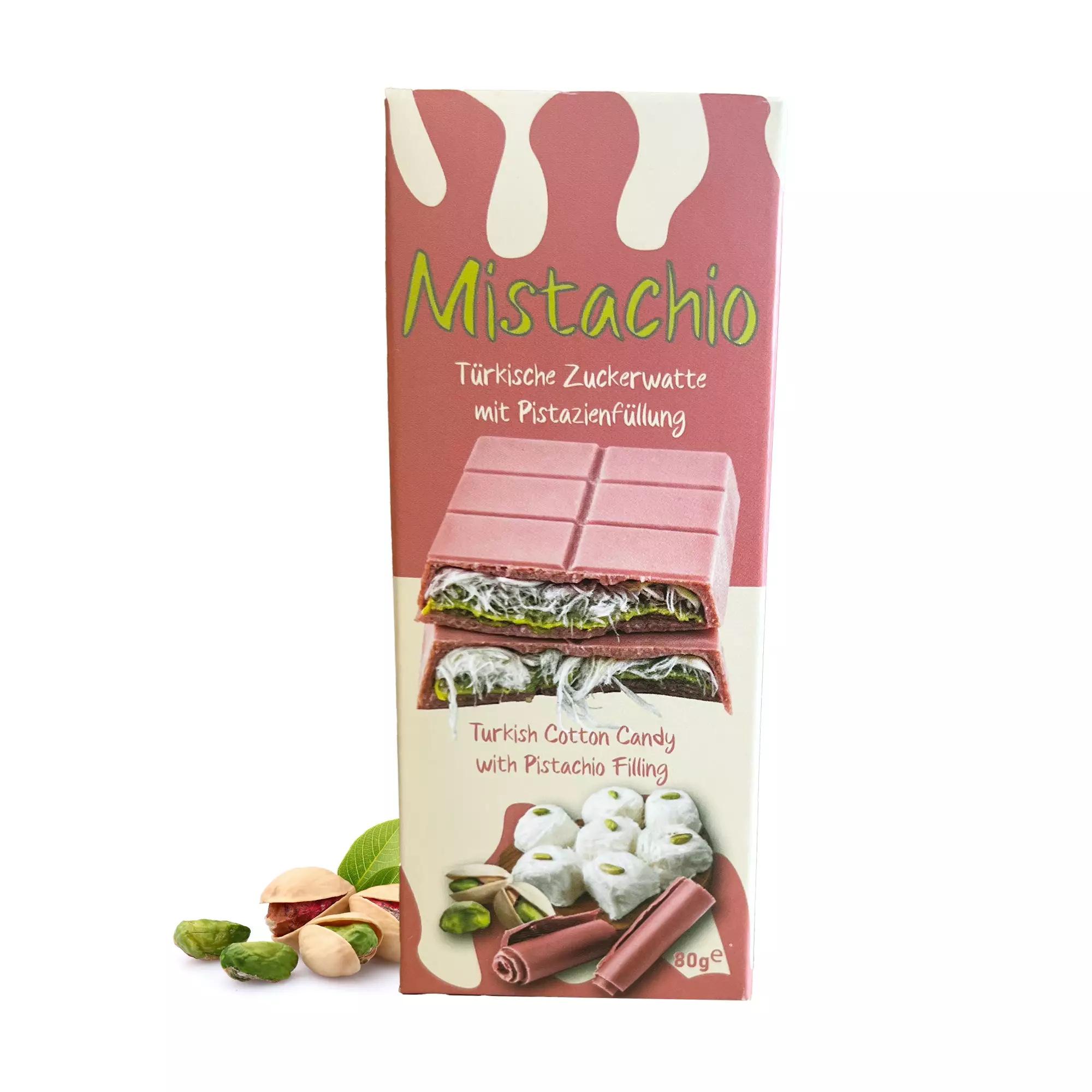 Mistachio – turkkilainen hattaravalkosuklaa Pistaasia, suklaata ja hattarasäikeitä, jotka tunnetaan myös enkelihiuksina. Maku- ja tuntoaistit kehräävät, kun haukkaat tätä kermaista vadelmavalkosuklaata. Ensin lohkeaa vadelmasuklainen ulkokuori ja sitten rouskuu pistaasi ja paahdettu sokerinen hattara. Vedelmasuklaata, pistaasia ja hattarataikinaa