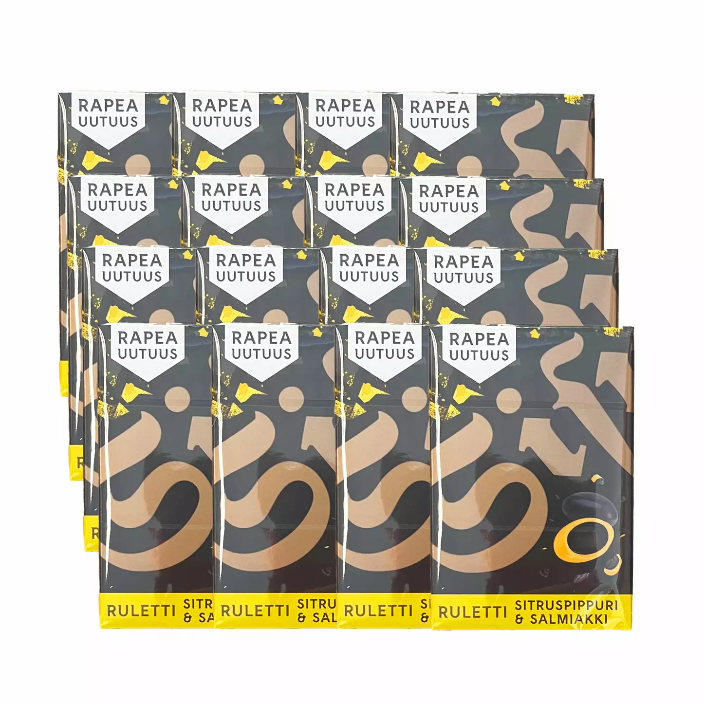 sokeria, sakeuttamisaineita (arabikumia, pektiiniä), glukoosisiirappia, vettä, ammoniumkloridia (=salmiakkia), lakritsiuutetta, suolaa, luontaisia aromeja, värejä (kurkumiinia, lääkehiiltä), seljanmarjauutetta, pintakäsittelyainetta (karnaubavahaa)