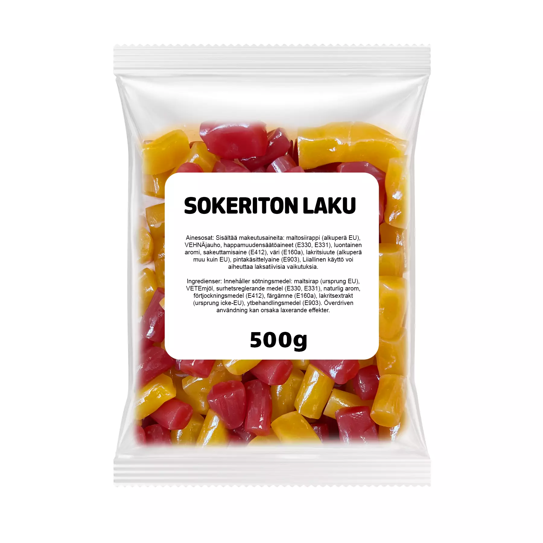 Ingredienser: Innehåller sötningsmedel: maltsirap (ursprung EU), VETEmjöl, surhetsreglerande medel (E330, E331), naturlig arom, förtjockningsmedel (E412), färgämne (E160a), lakritsextrakt (ursprung icke-EU), ytbehandlingsmedel (E903). Överdriven användning kan orsaka laxerande effekter.