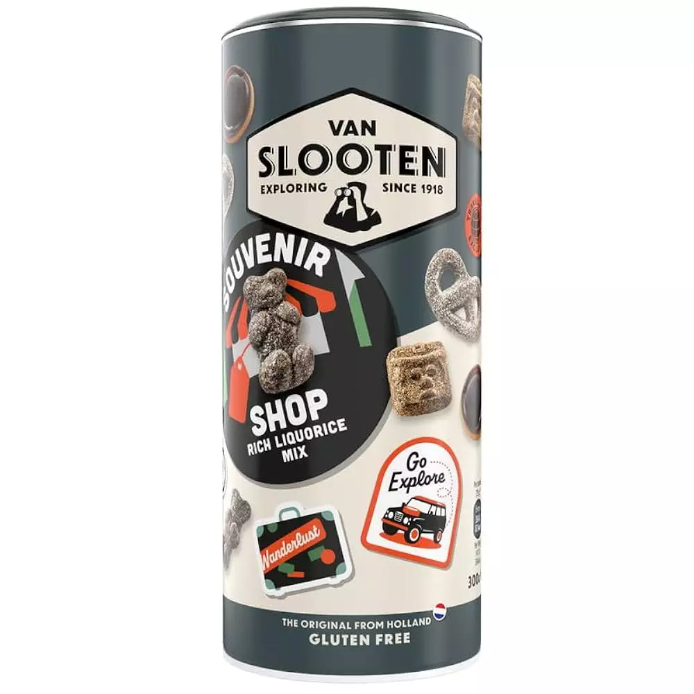 Salmiakin ja lakrtisinmakuisia karkkeja legendaarisessa ”taxfree-shopin” peltipurkissa. Hollantilainen takuuvarma tuliainen laivalta tai lentomatkoilta.