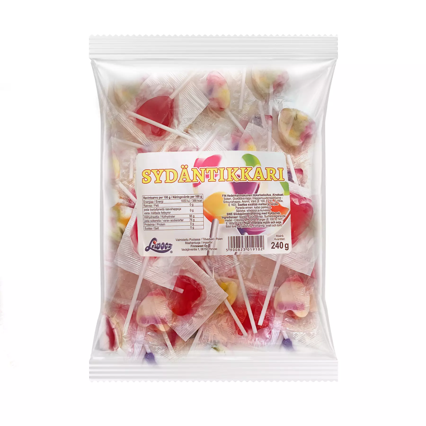 Tikkarisekoitus erilaisia ja makuisia, sydämenmuotoisia tikkareita reilussa 240g pussissa.