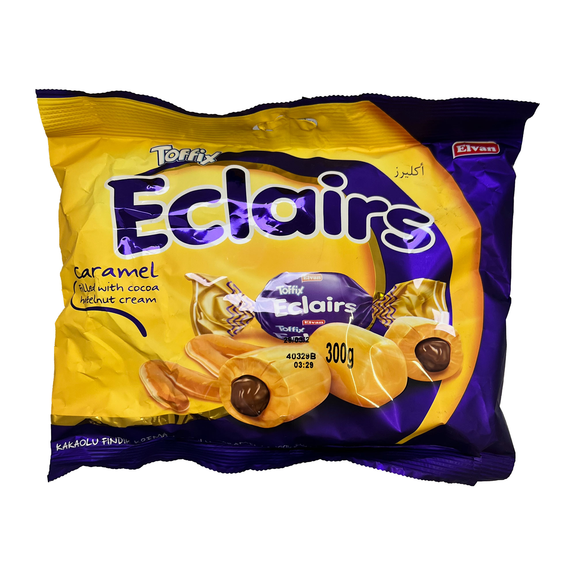 Eclairs kermatoffee kaakao-hasselpähkinätäytteellä. Hento, suolainen pinta kätkee sisäänsä Eclairs kermatoffee kaakao-hasselpähkinätäytteellä. Hento, suolainen pinta kätkee sisäänsä pehmeän kaakaosydämen, jossa aavistus hasselpähkinää. Toffeepala ei ole liian suuri, joten niitä on valitettavan helppo popsia suurempikin määriä makeannälkään. Valmistusmaa Turkki.