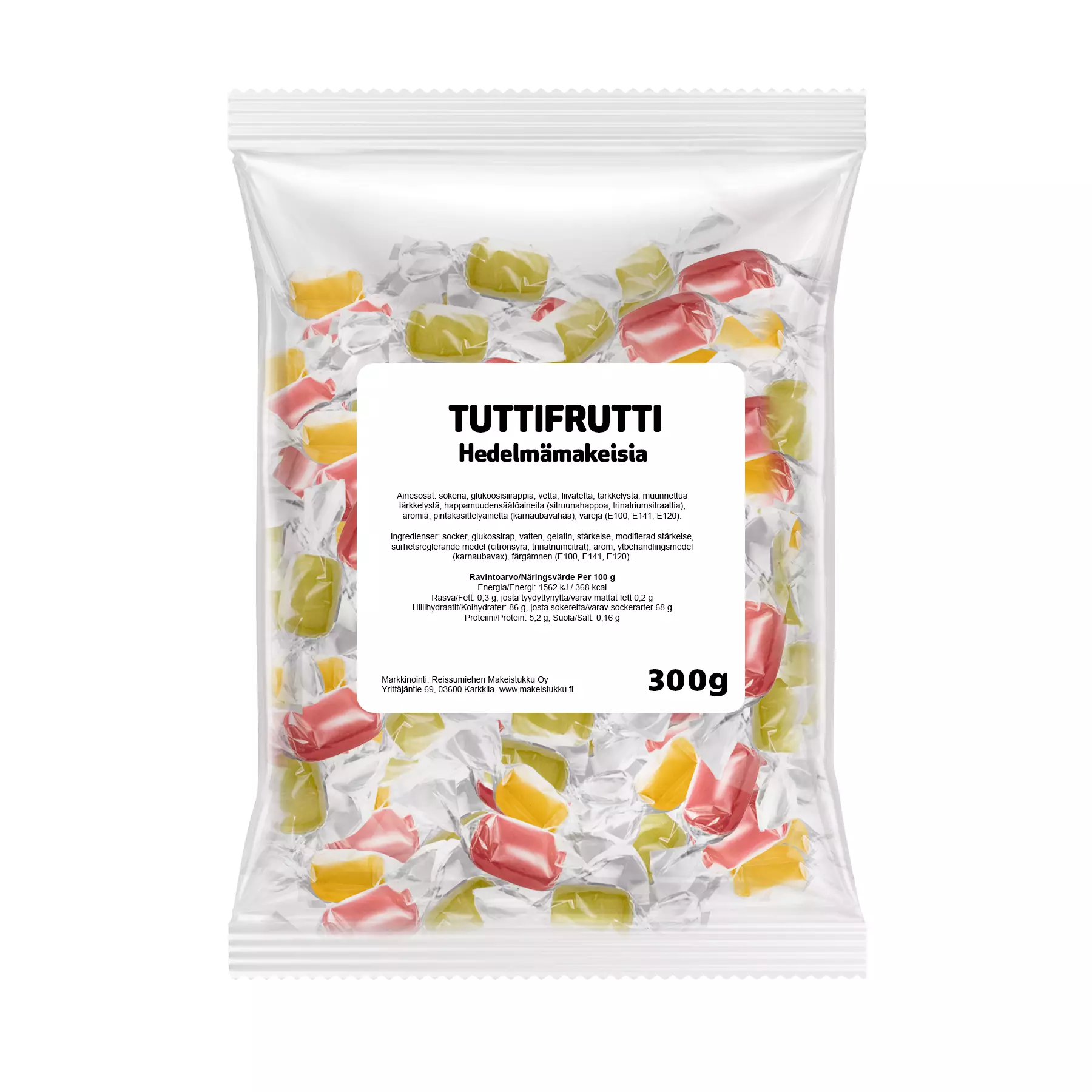 Malacon Tuttifrutti -hedelmämakeiset twistaavat iloisilla väreillään, pehmeällä rakenteellaan ja hedelmäisellä maullaan. Makeiset sopivat täydellisesti arjen herkkuhetkiin, juhliin, kahviloiden ja myyntipisteiden makeisvalikoimaan.
