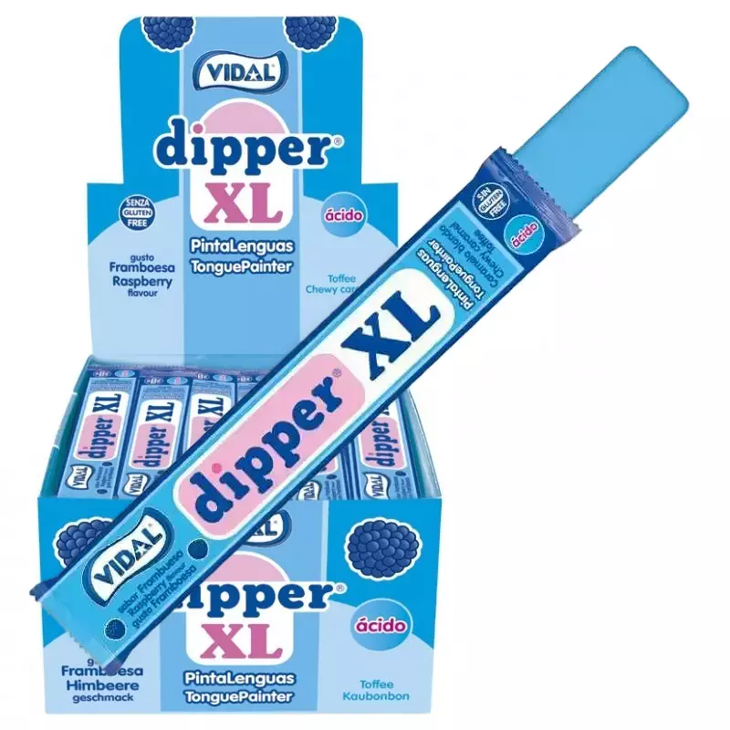 Vidal Blue Raspberry Dipper XL on pehmeä ja sitkeä toffeepatukka. Raikkaan sininen toffee maistuu kirpeältä vadelmalta.