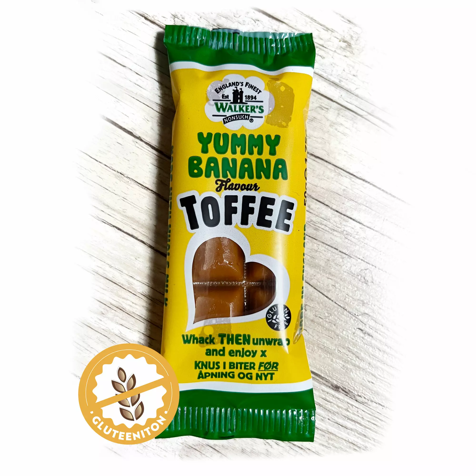 Walkersin takuuvarma banaanitoffeepatukka ja muuten niin kovaa tämä toffee, että voit tarvita vasaran avuksesi. Hakkaa tai murskaa vasaralla pakkauksen läpi, nauti sitten sopvina suupaloina. Niin paljon banaania ja vielä enemmän toffeeta yhdessä patukassa. (Vasara ei tule patukan mukana, kuvalla vain havannollistetaan tuotteen omnaisuutta ja hakattavuutta.)